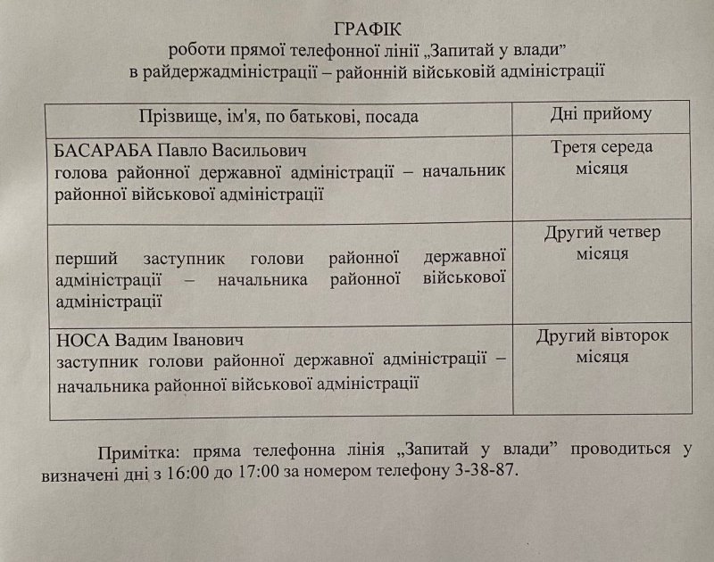 ГРАФІК роботи прямої телефонної лінії "Запитай у влади" в районні...