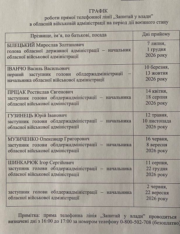 ГРАФІК роботи прямої телефонної лінії "Запитай у влади" в обласні...