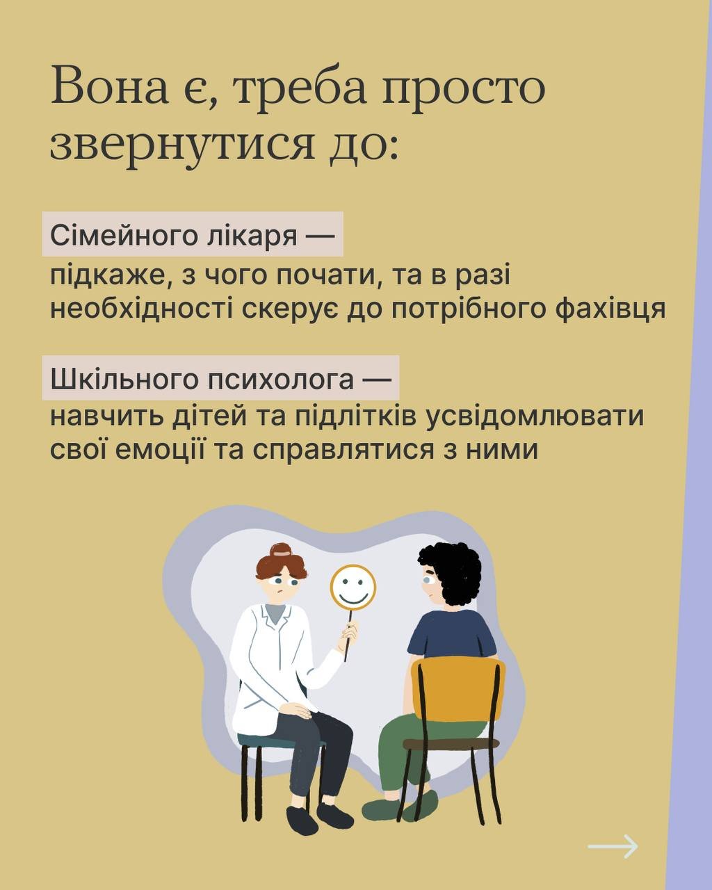 Підтримку для ментального здоров’я можна отримати й від сімейного лікаря, і від соцпрацівника. Головне — не боятися її шукати. А це зовсім нескладно. У каруселі маємо список перевірених місць, де про тебе потурбуються.