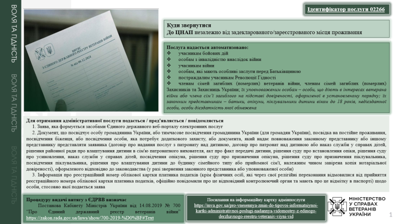 У зв’язку із внесенням змін до Положення про Єдиний державний реєстр ветеранів війни, затвердженого постановою Кабінету Міністрів України від 14 серпня 2019 року № 700, Департаментом соціальної політики оновлено інформаційно-презентаційні матеріали щодо адміністративної послуги “Надання відомостей з Єдиного державного реєстру ветеранів війни”.