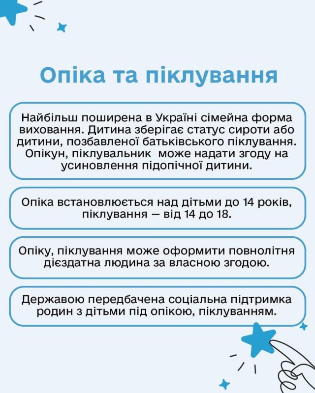 В Україні існує кілька сімейних форм виховання: опіка та піклування, прийомна сім’я, дитячий будинок сімейного типу.