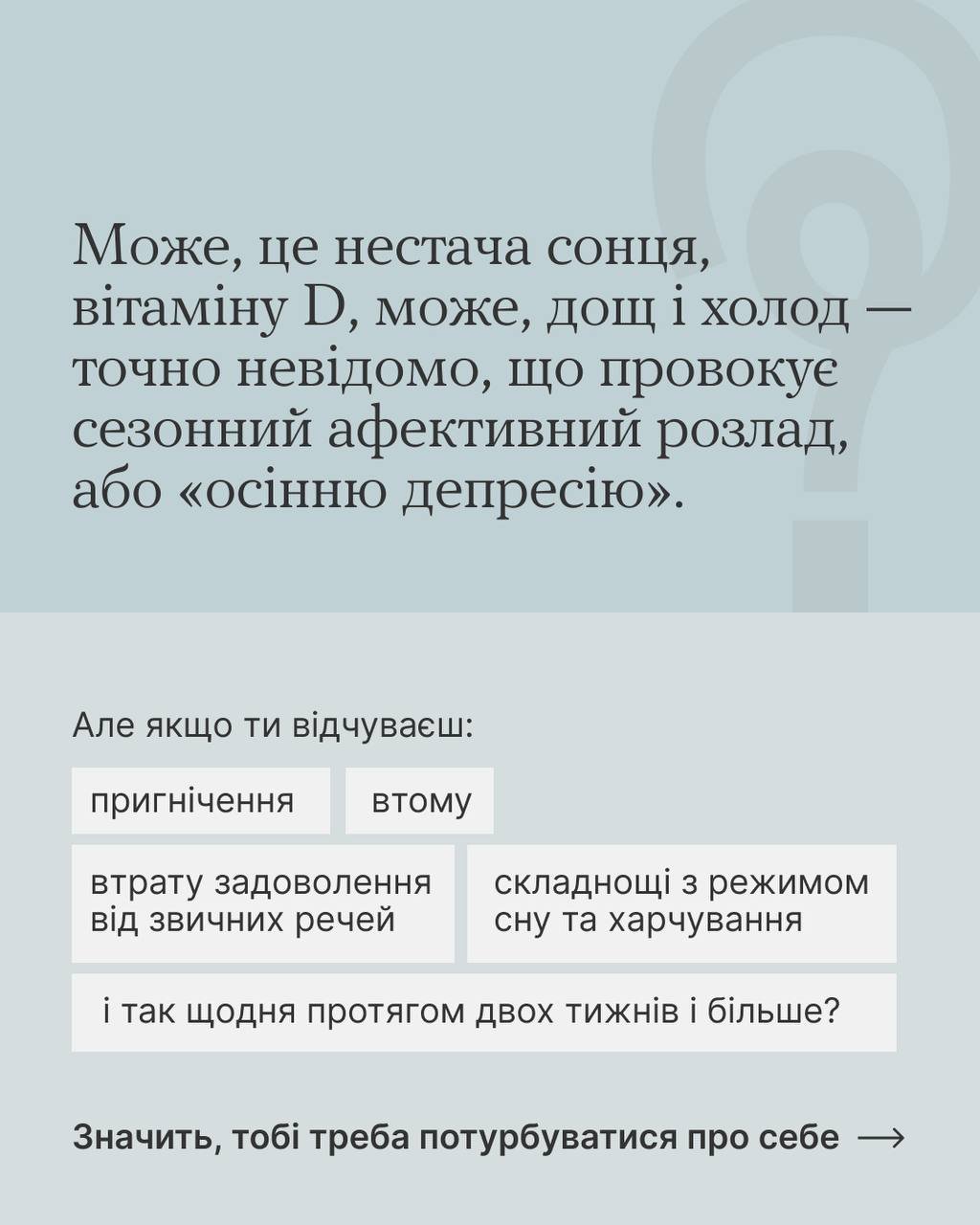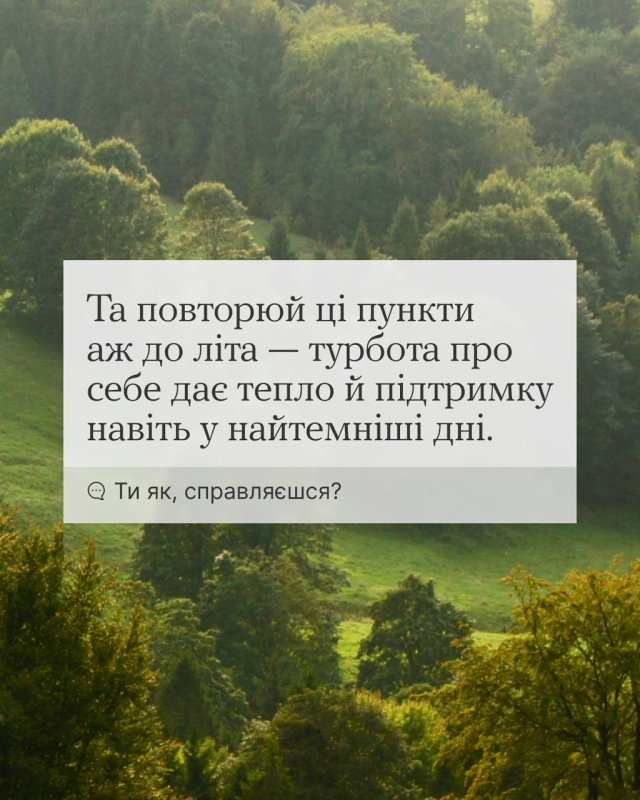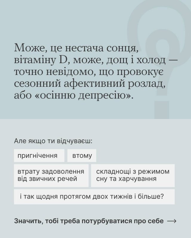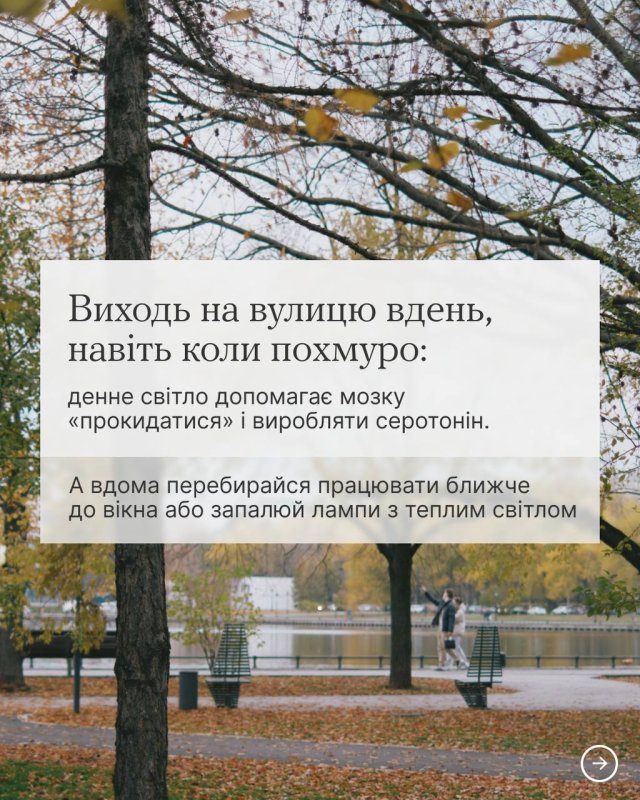 Коли дні стають коротші, а настрій знижується разом із температурою повітря, гортай карусель, щоб не впасти у сезонну депресію. У картках цілий план, де можна взяти сили жити восени. Як завжди, ефективний, бо простий.