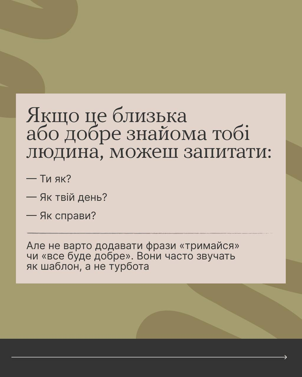 А в голові зберігай правило: не такі важливі ідеальні слова, як людяність — спокій, щирість, повага. У них завжди найкращі прояви підтримки.
