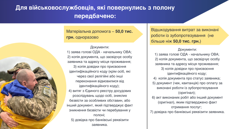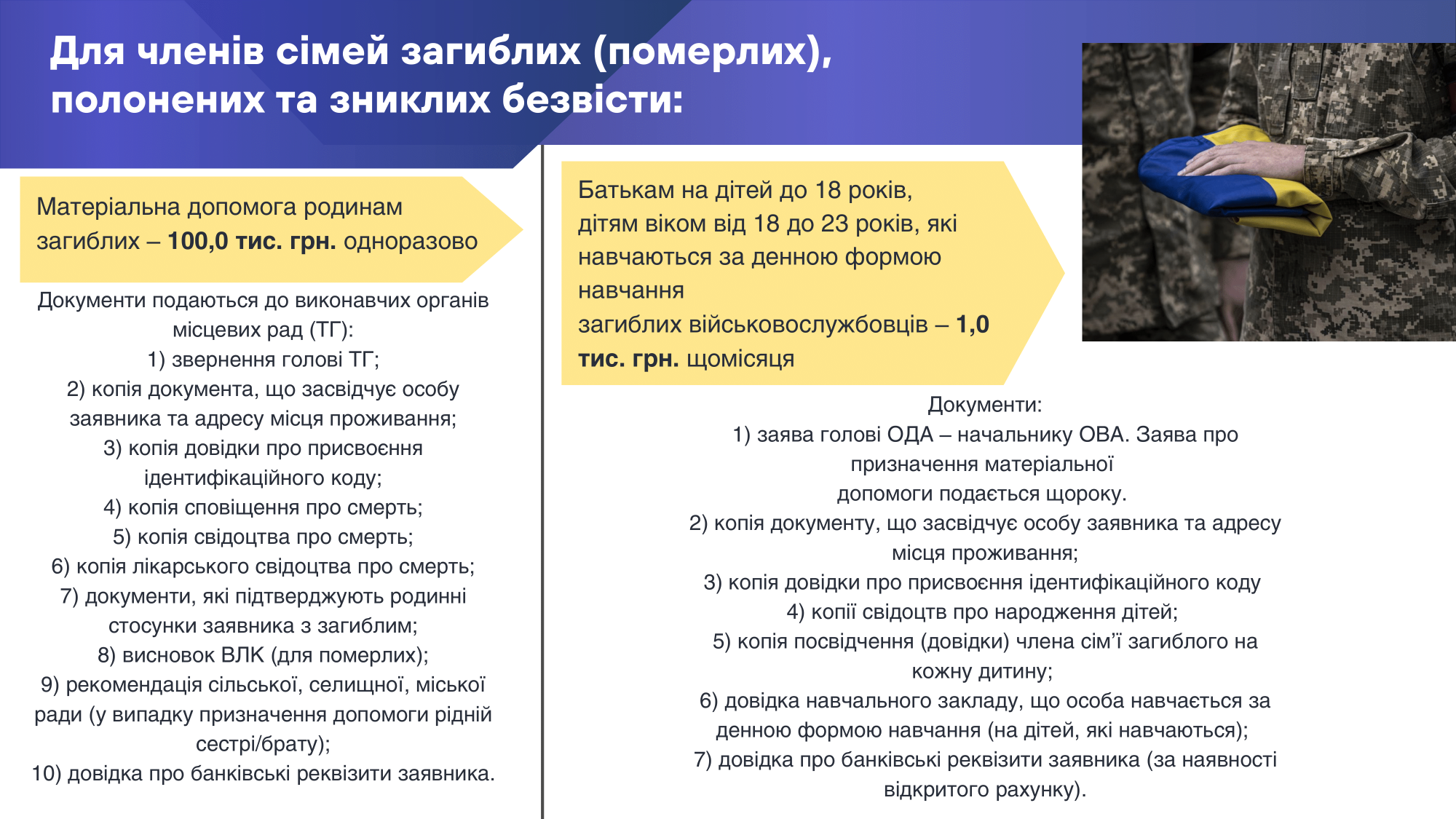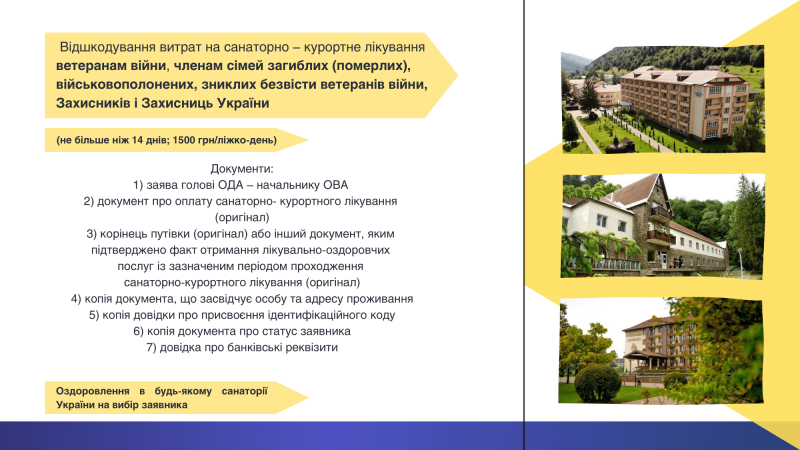 Надано детальні роз’яснення про порядок надання матеріальної допомоги ветеранам війни, військовослужбовцям та членам їх сімей, а також про механізм відшкодування витрат за самостійне санаторно-курортне лікування ветеранів війни та членів сімей загиблих (померлих) Захисників і Захисниць України. Окремо наголошено на можливості відшкодування витрат за зубопротезування, що є важливою складовою медичної підтримки осіб, які брали участь у захисті держави.