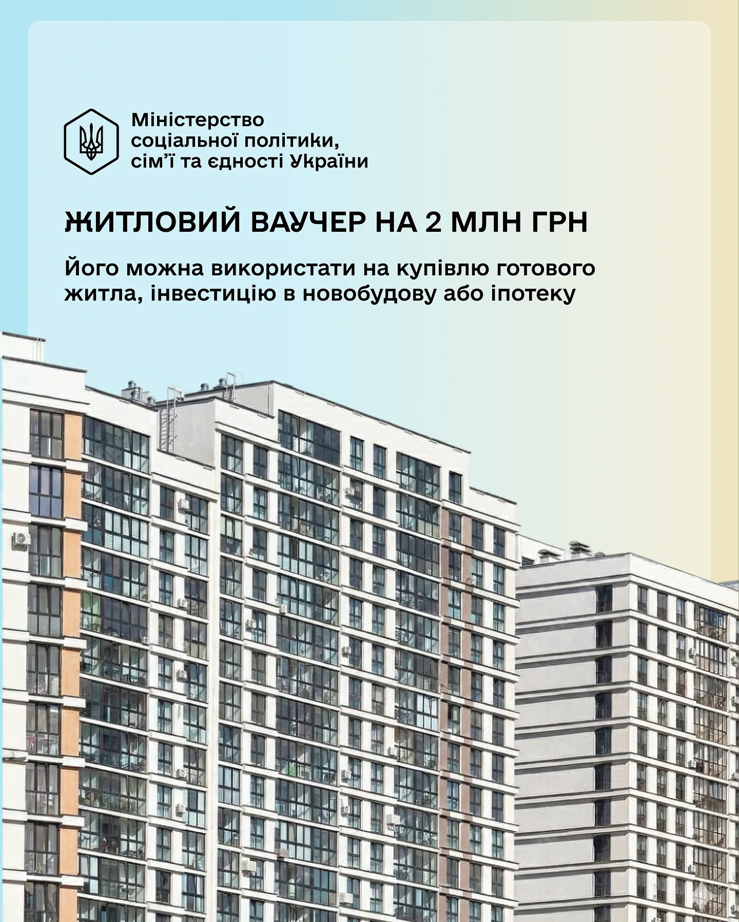 В Україні запрацювала програма житлових ваучерів для внутрішньо переміщених осіб, чиї домівки залишилися на тимчасово окупованих територіях. Ваучер — це 2 млн грн на купівлю, будівництво або іпотеку.