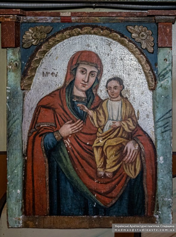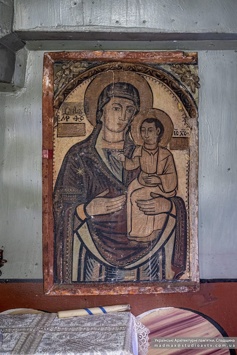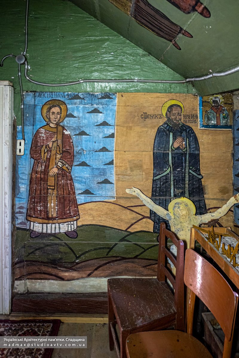 В інтер'єрі знаходяться позолочений різьблений іконостас (18 ст.) та настінні розписи, які є визначними творами народного малярства 17 ст. У наві розміщені композиції на сюжети «Страстей Господніх», у бабинці збереглися фрагменти «Страшного суду», постаті святих, серед яких вміщений портрет ктитора храму священика Никоря. Особливим монументалізмом вирізняється розташований на склепінні образ Пресвятої Богородиці «Знамення», написаний у традиціях народного декоративного мистецтва.