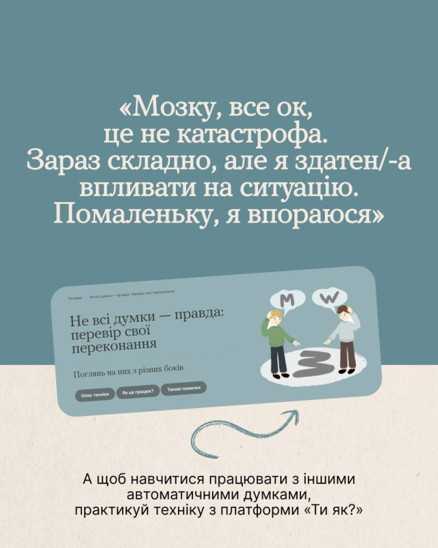 Дізнайся, як можна працювати з думками, щоб зберегти ресурси на розв'язання проблем, а не хвилювання. Забирай техніку «Не всі думки — правда» на платформі «Ти як?».