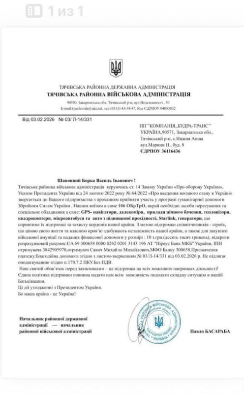 Повідомляю, що на території району зафіксовані факти шахрайських дій, коли невідомі особи від мого імені, як голови Тячівської районної державної адміністрації, звертаються до підприємців із проханням перерахувати кошти нібито на потреби Збройних Сил України.