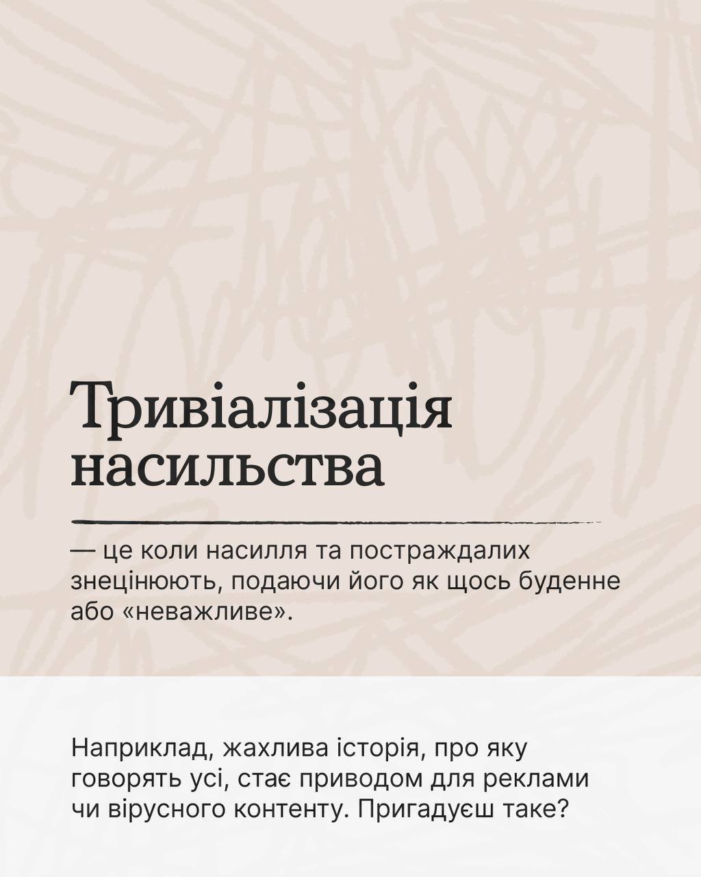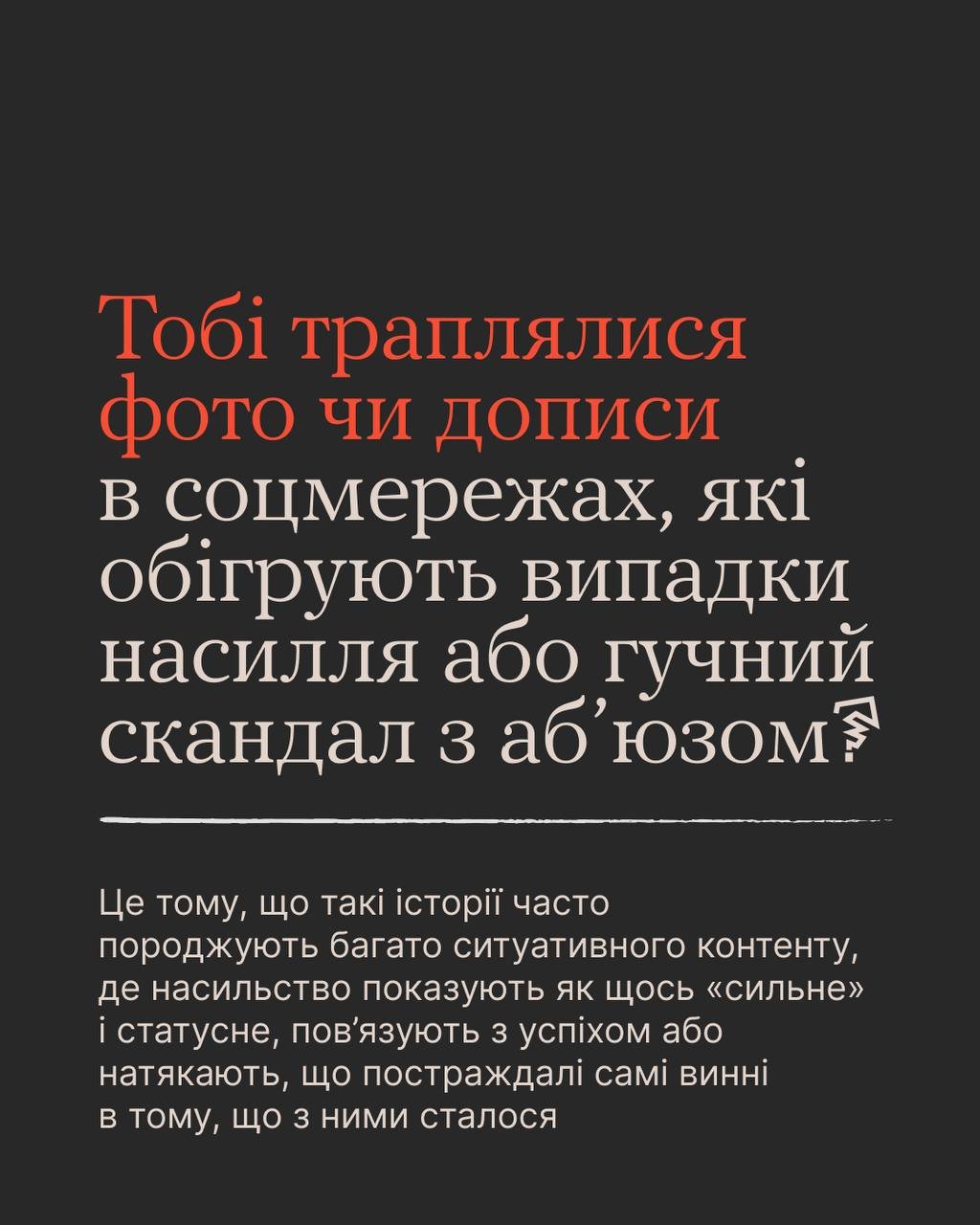 Але ти точно можеш не використовувати чужий біль як тему для контенту. Бо привертати увагу до проблеми і говорити про неї серйозно й чесно — це одне. А зовсім інше — робити собі актив у профілі на такому «ситуативі».