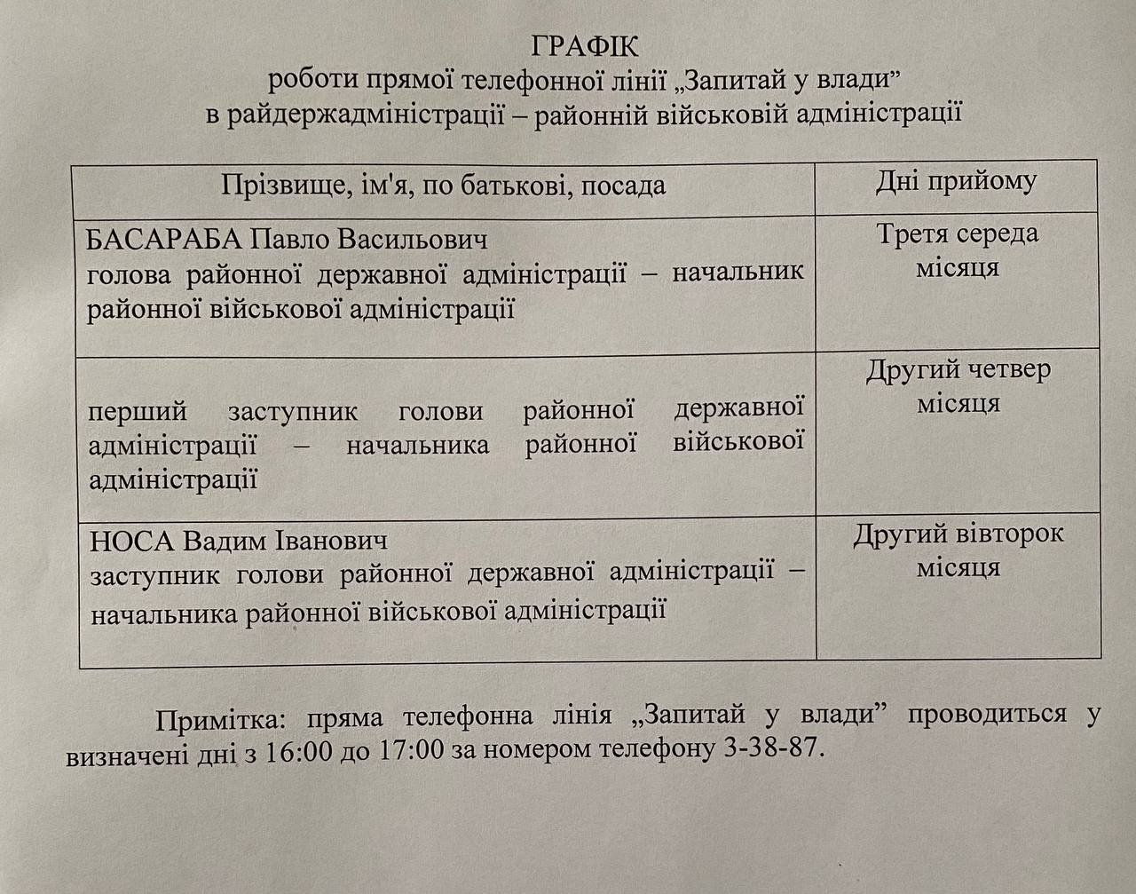 ГРАФІК роботи прямої телефонної лінії "Запитай у влади" в районній державній адміністрації - районній військовій адміністрації