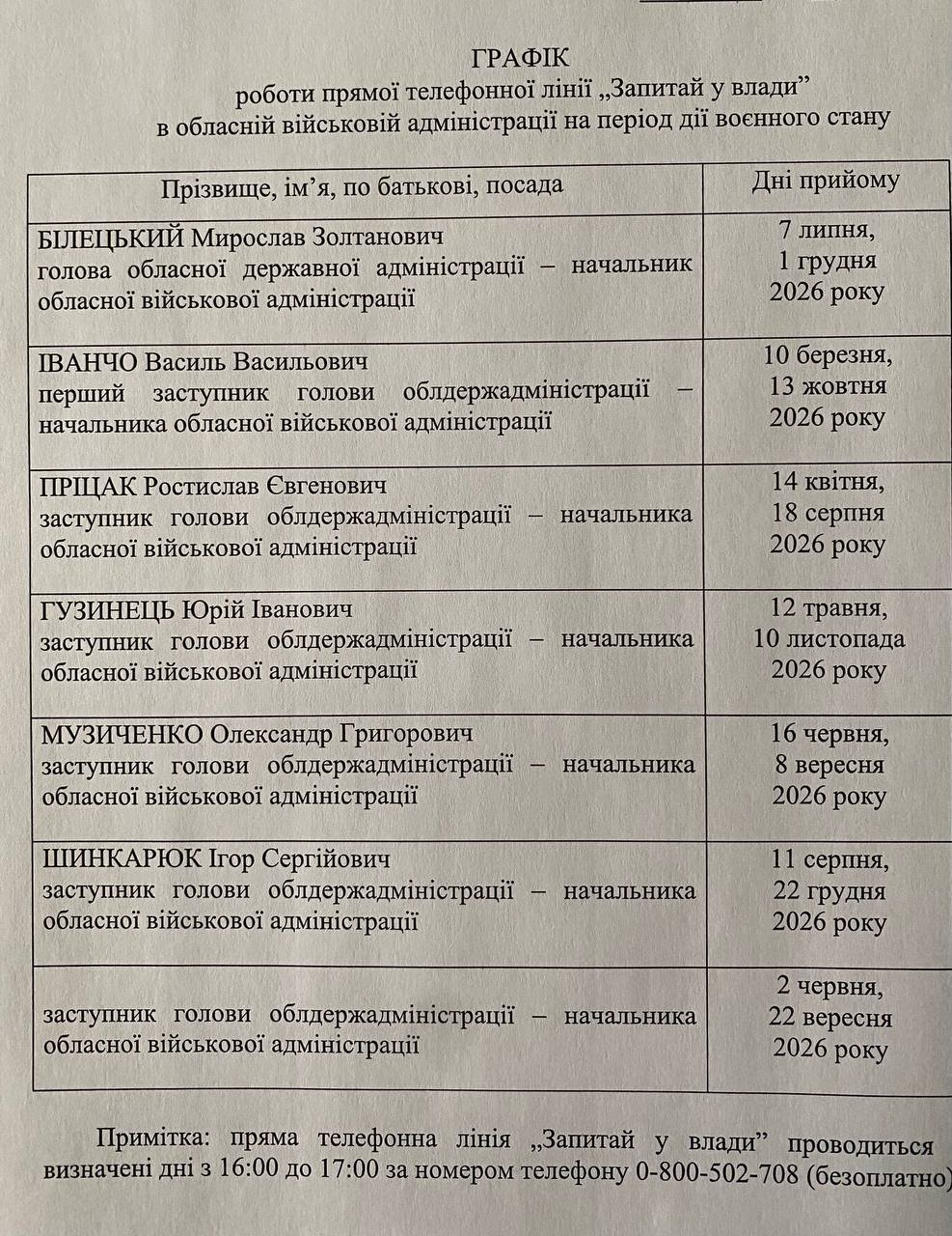 ГРАФІК роботи прямої телефонної лінії "Запитай у влади" в обласній військовій адміністрації на період дії воєнного стану