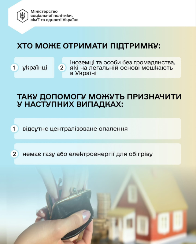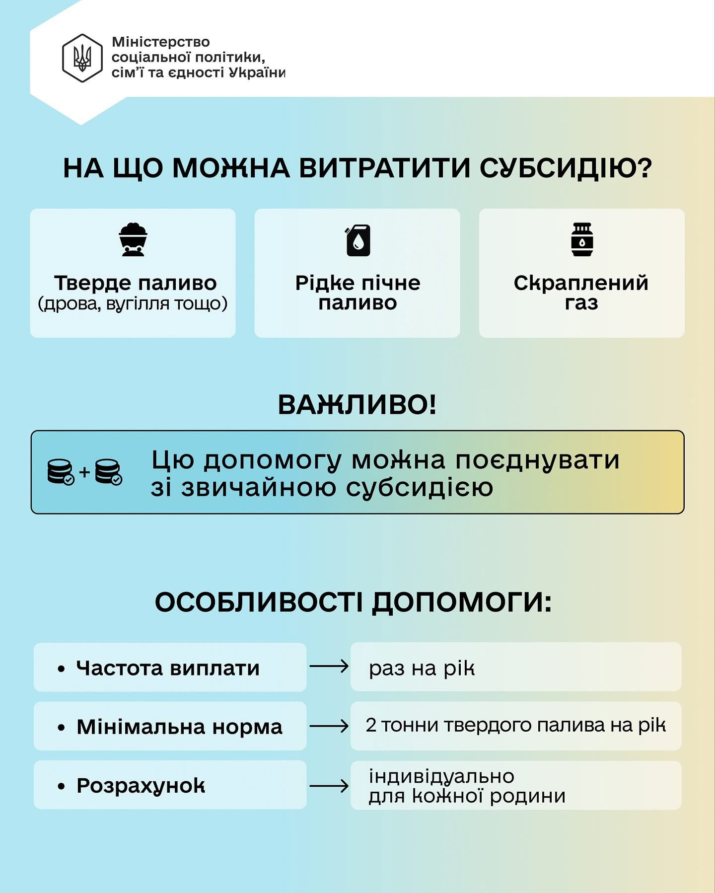 Держава передбачила окрему підтримку для домогосподарств без централізованого опалення, газу чи електроопалення — субсидію на придбання дров, вугілля, рідкого пічного палива та скрапленого газу.