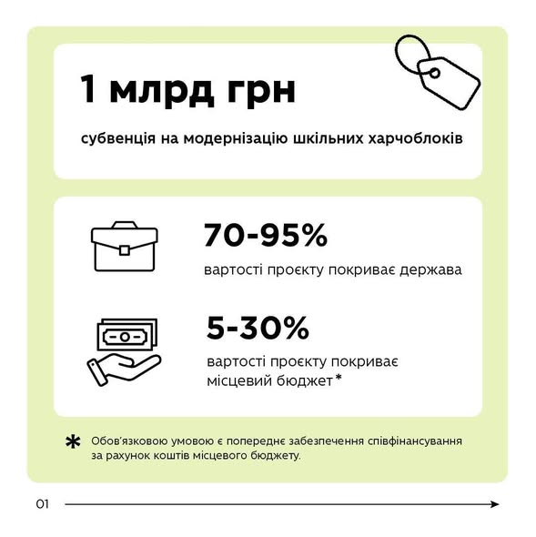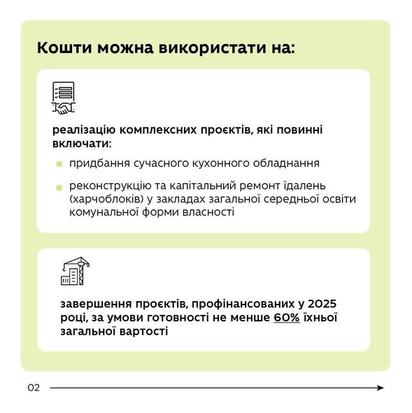 Уряд виділив 1 млрд грн субвенції на оновлення харчоблоків у 2026 році. Кошти також можна залучити на капітальний ремонт їдалень або завершення об’єктів, готових на понад 60%.