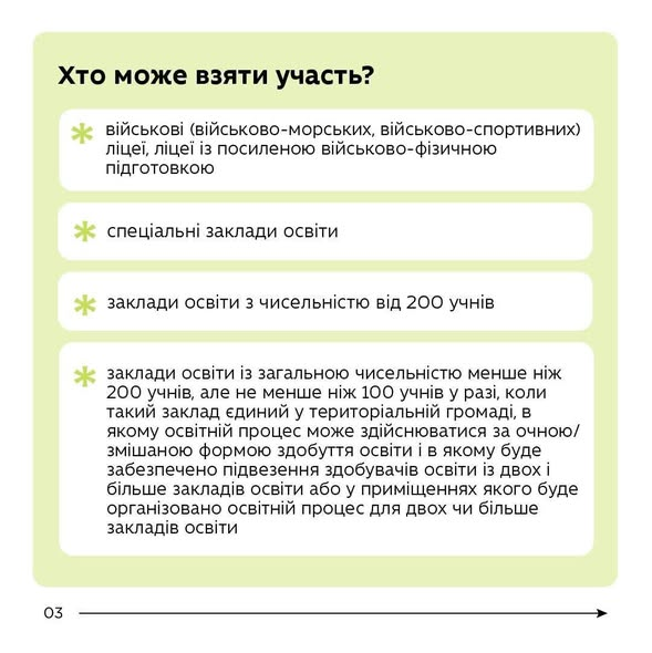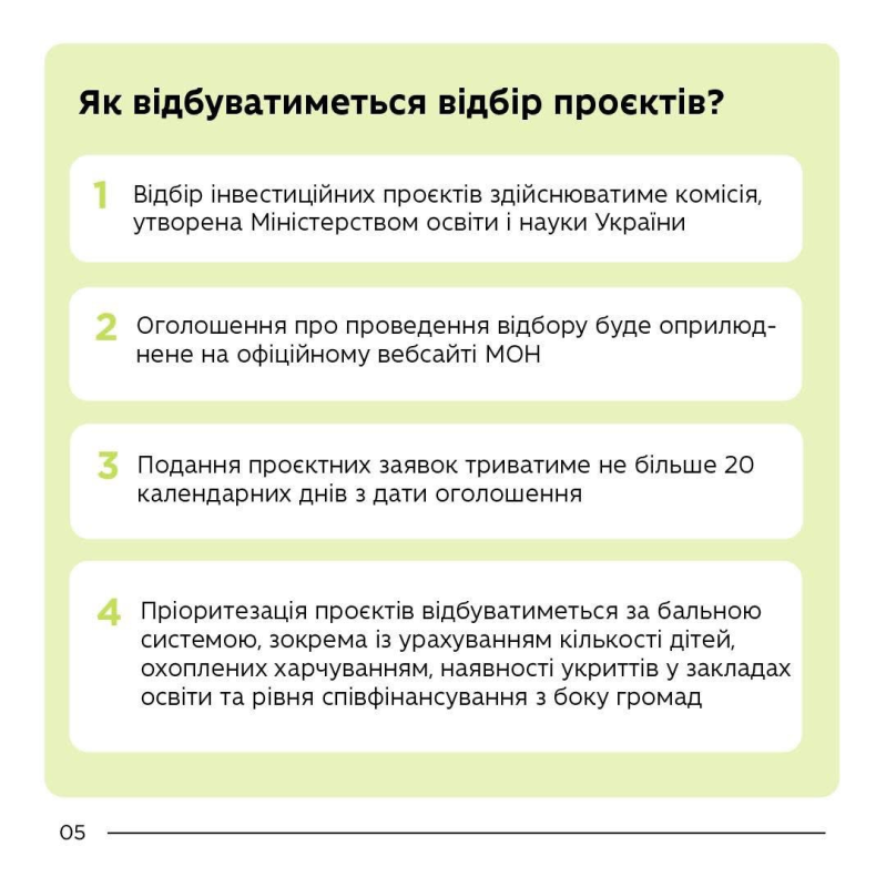 Спеціальна комісія МОН обиратиме переможців за бальною системою, де врахують кількість учнів, наявність укриття та рівень співфінансування громади.