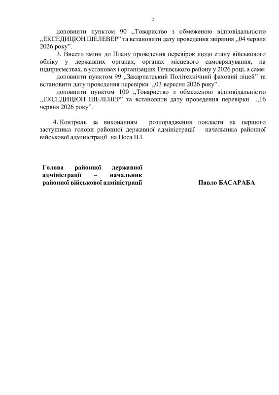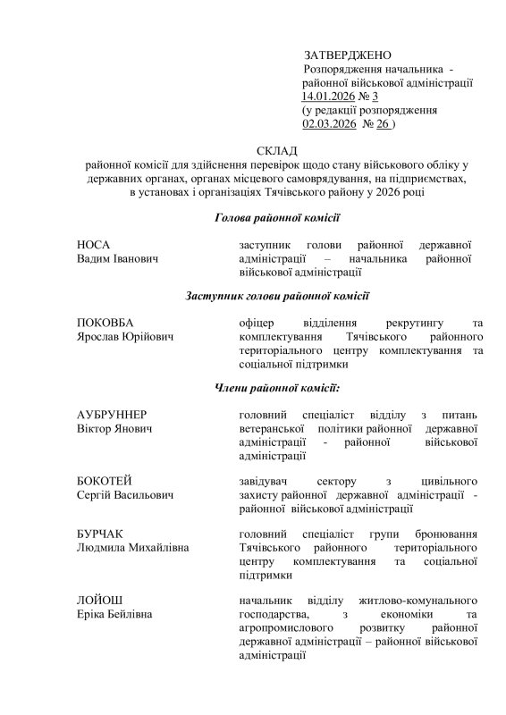 Про внесення змін до розпорядження голови районої державної адміністрації - начальника районної військової адміністрації від 14.01.2026 року №3 "Про стан військового обліку на території Тячівського району у 2025 році та завдання на 2026 рік"
