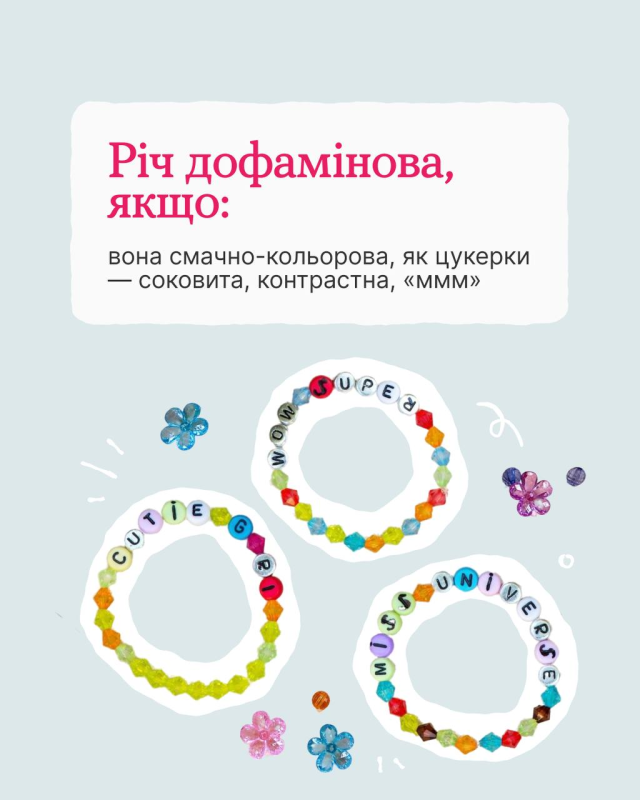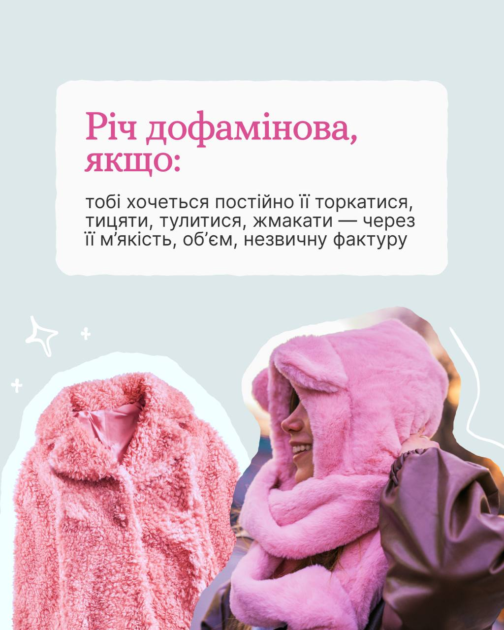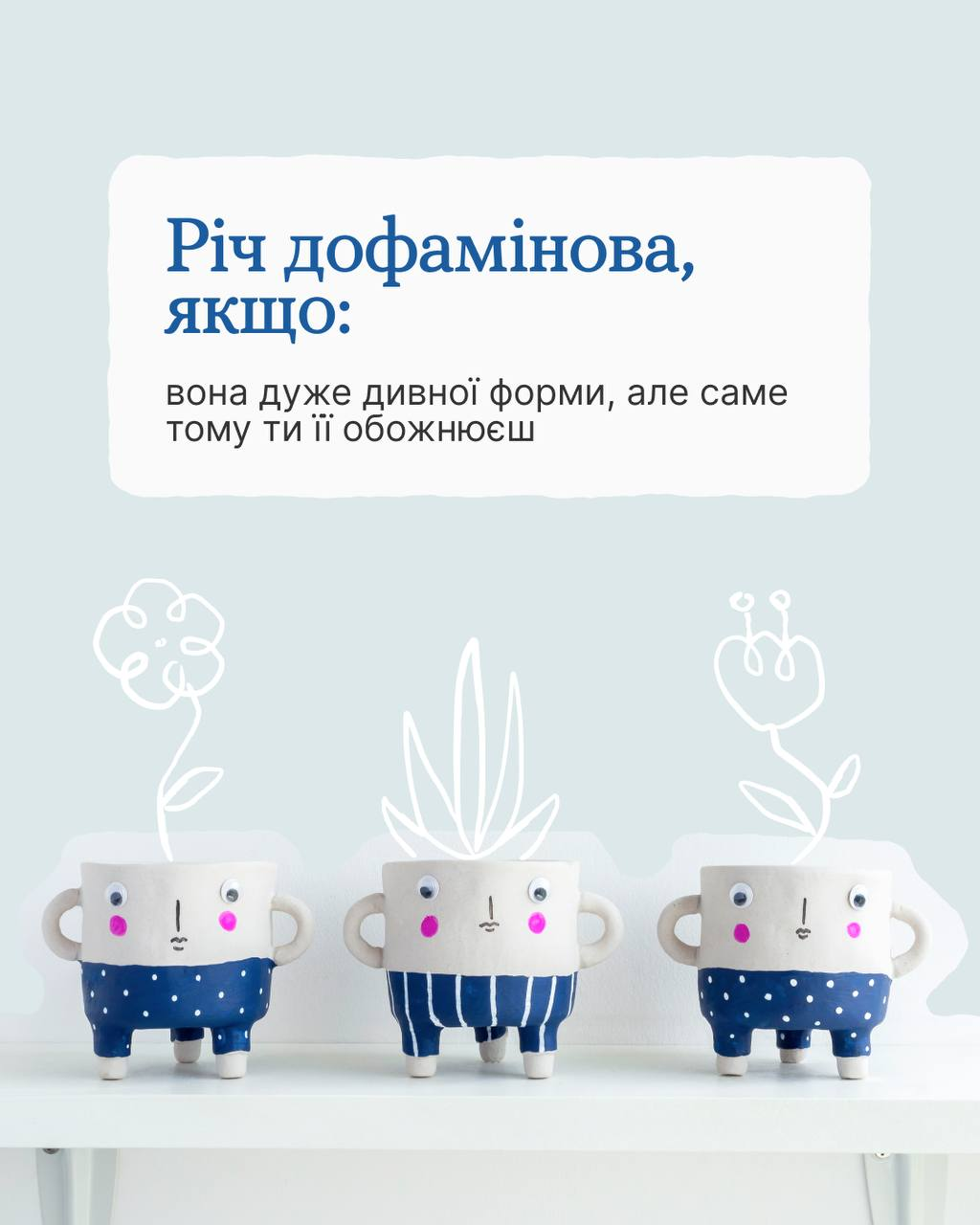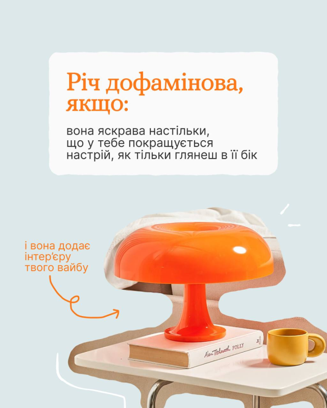 І ні, це не означає, що треба купувати речі, щоб покращувати свій стан. Часто такі дофамінові штучки дрібні, придбані випадково або знайдені серед сімейних реліквій, але вайбові й дорогі серцю. Маєш такі?
